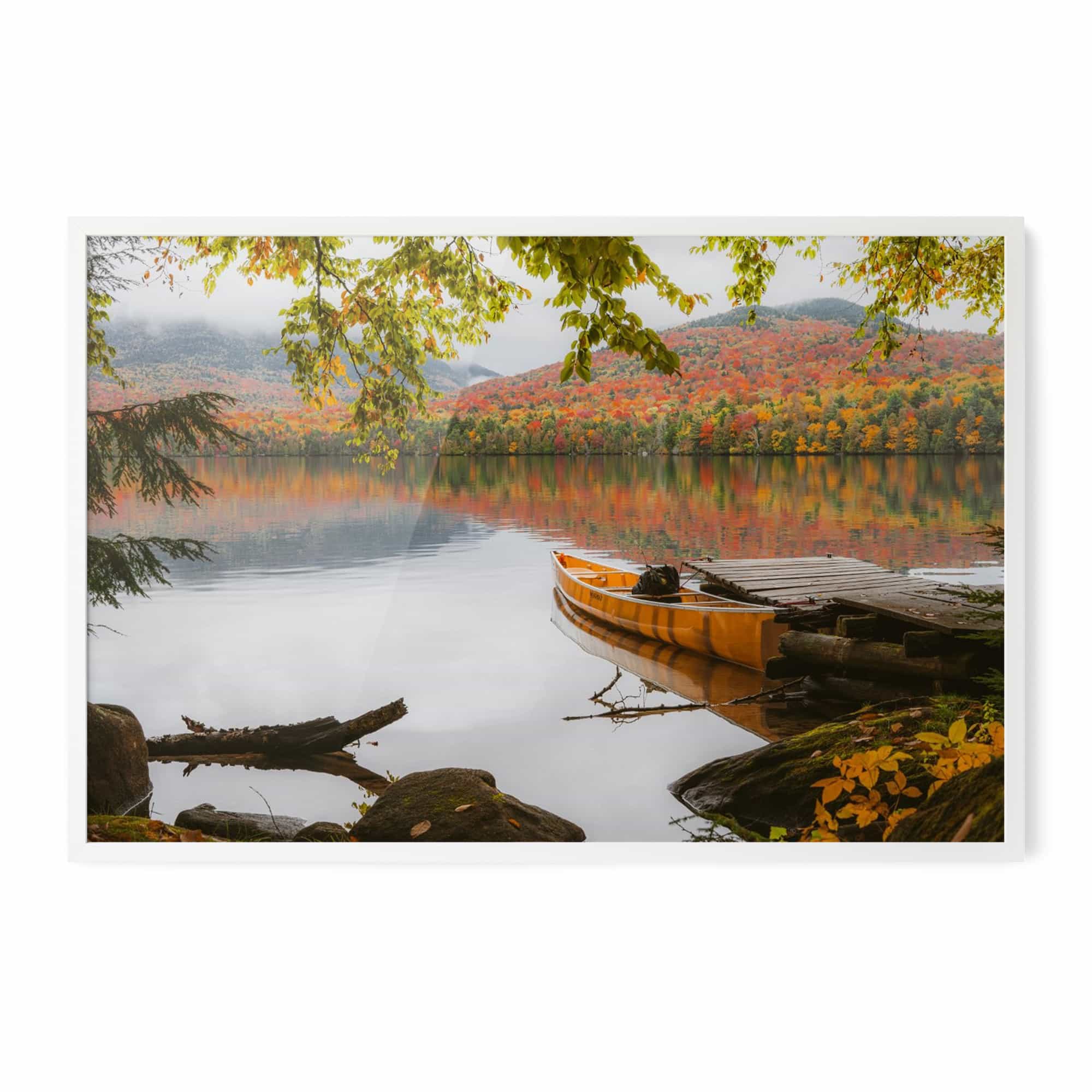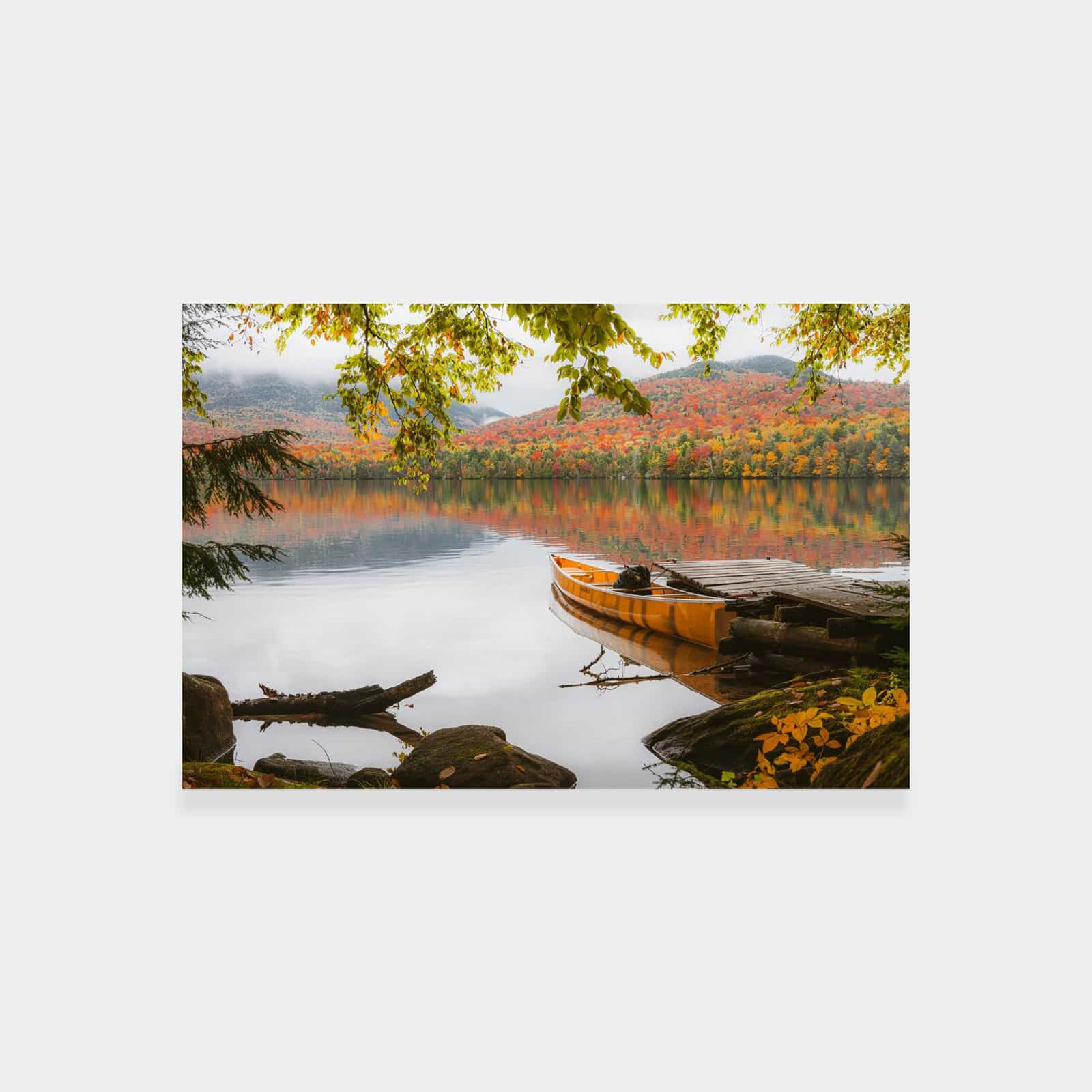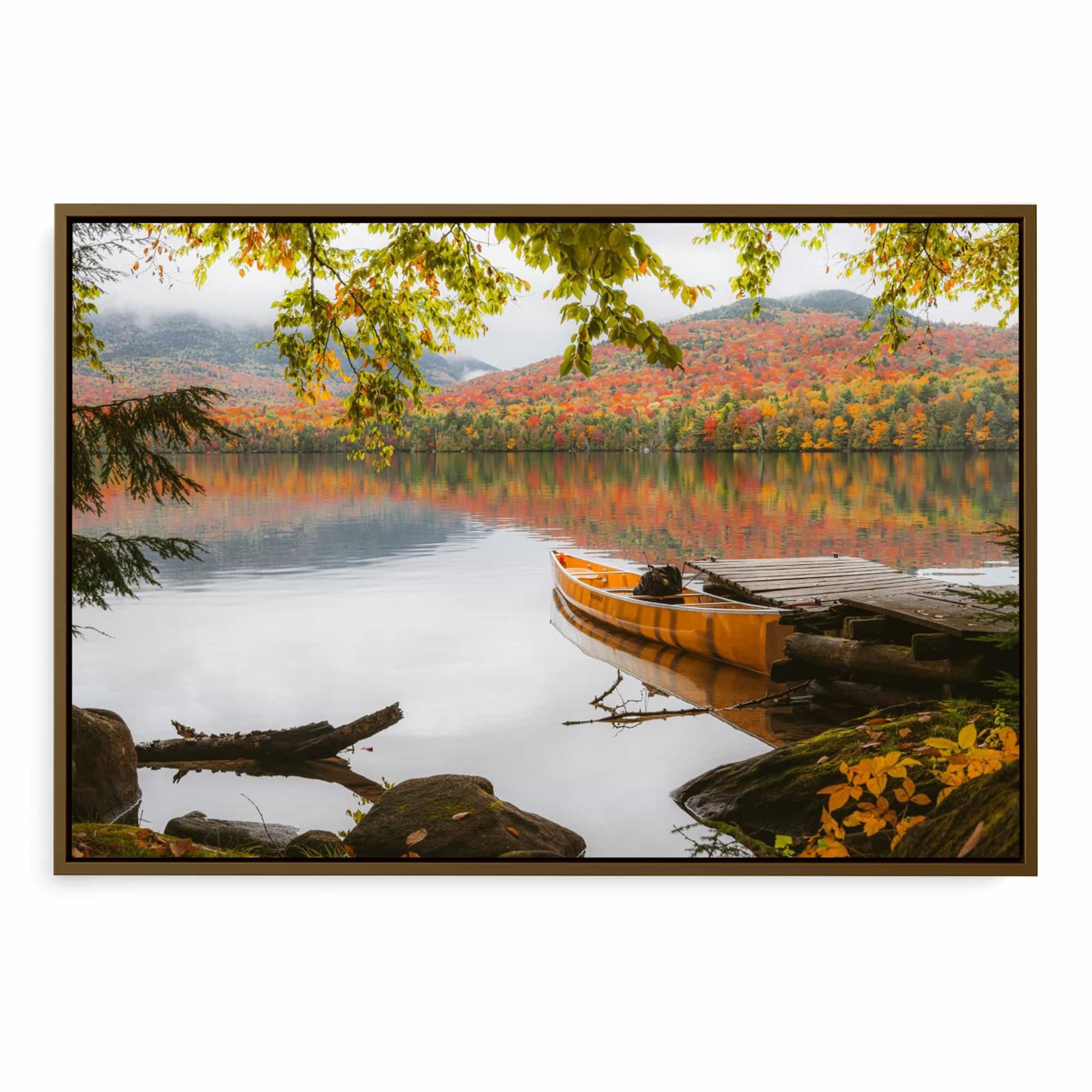 Autumn Morning on Lake Placid Dock with Canoe