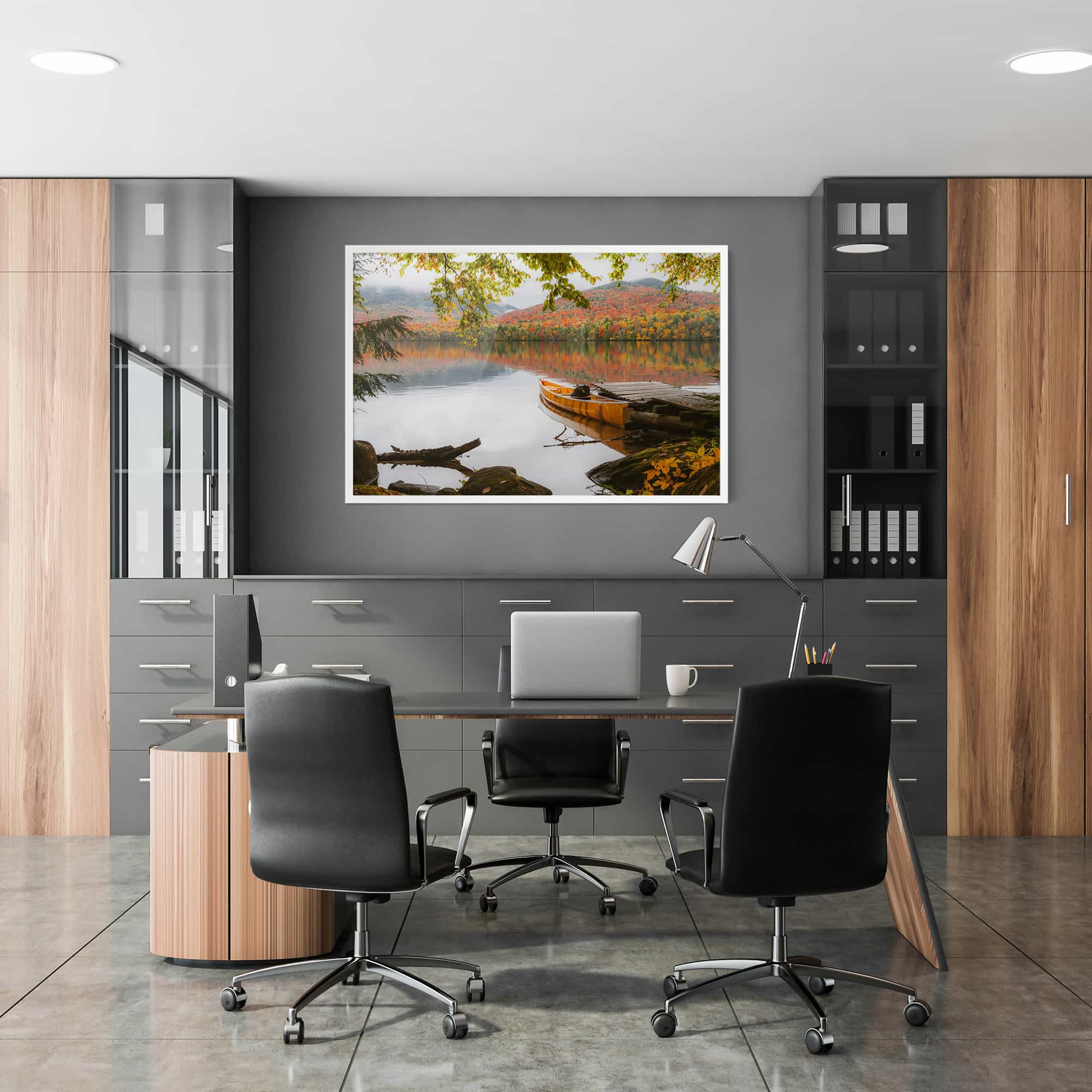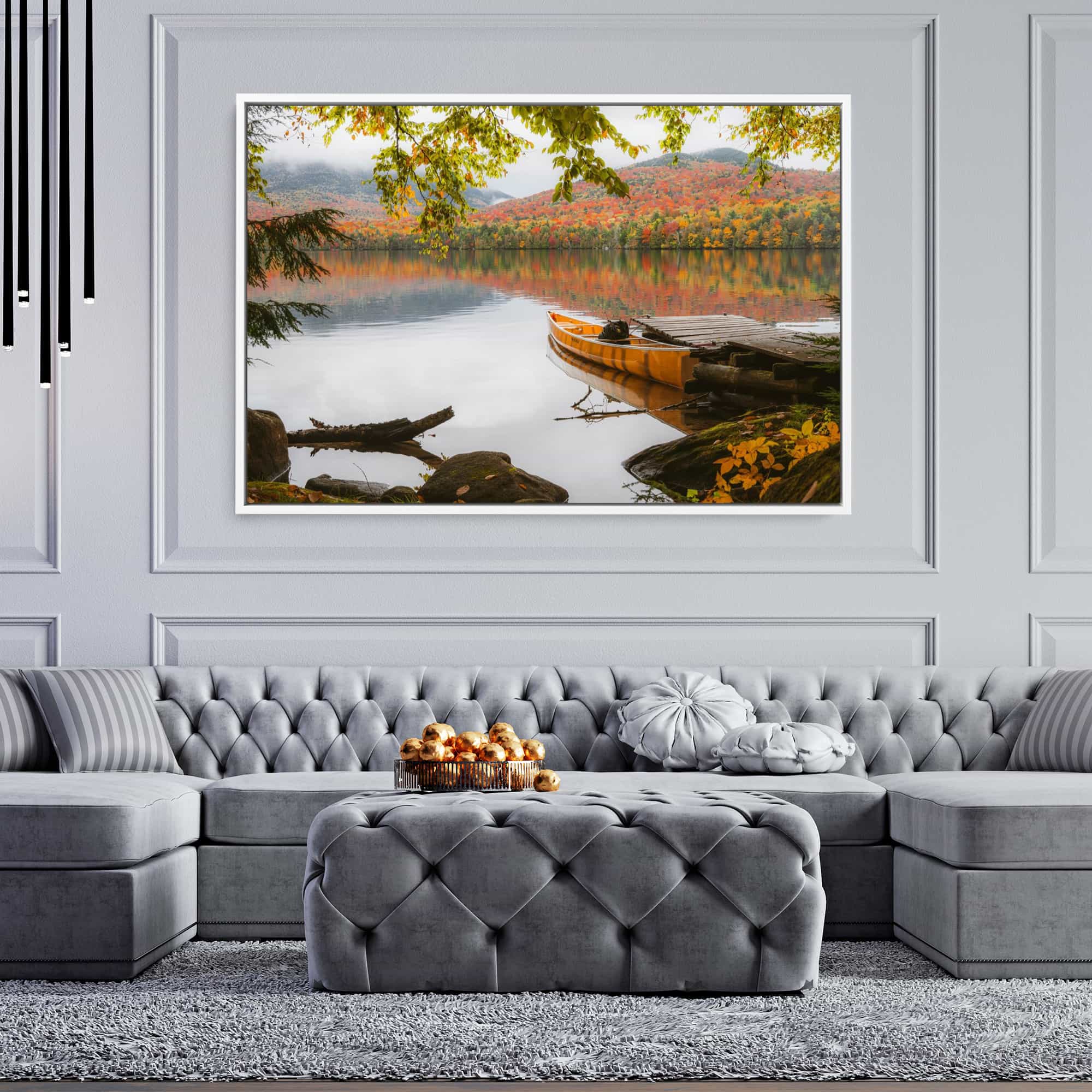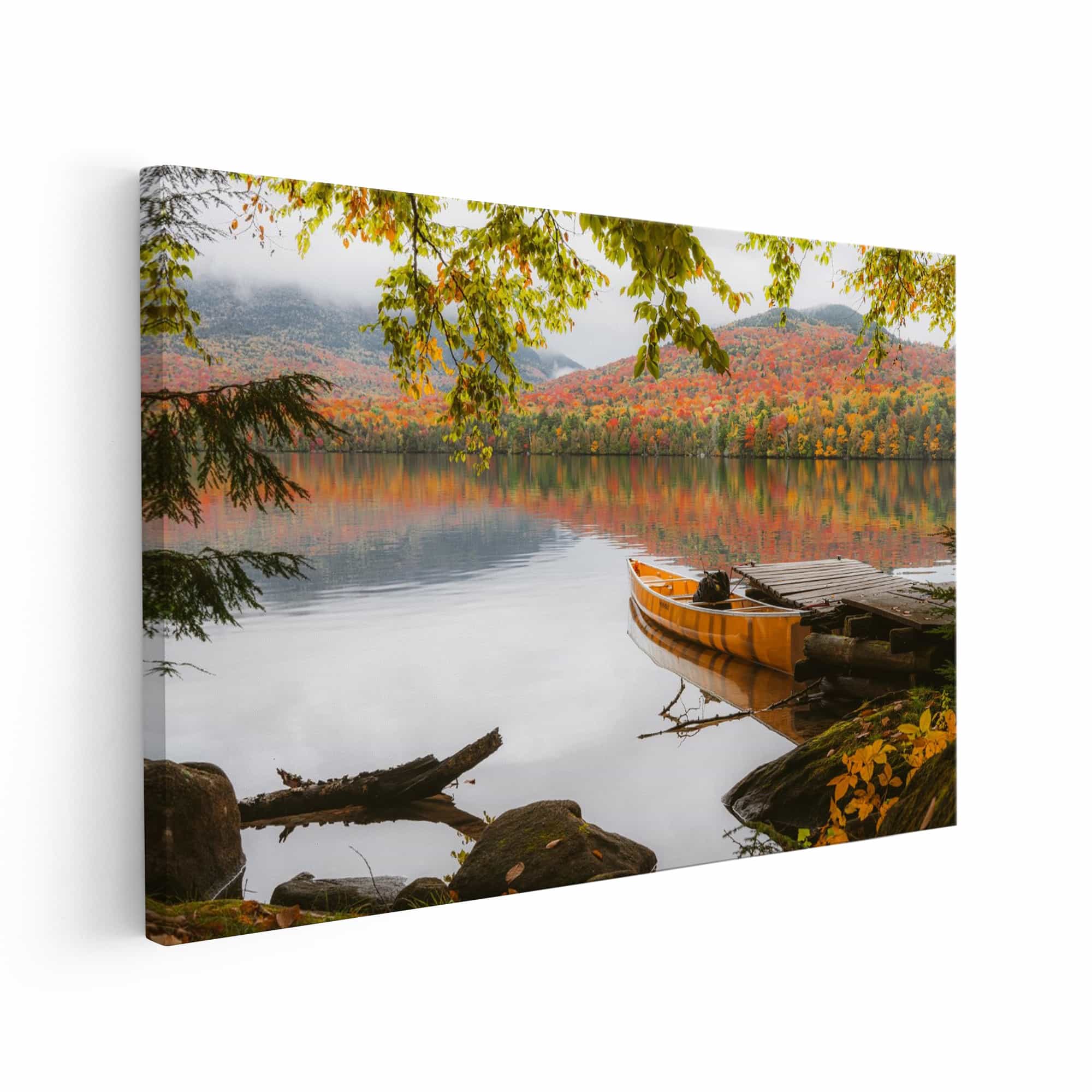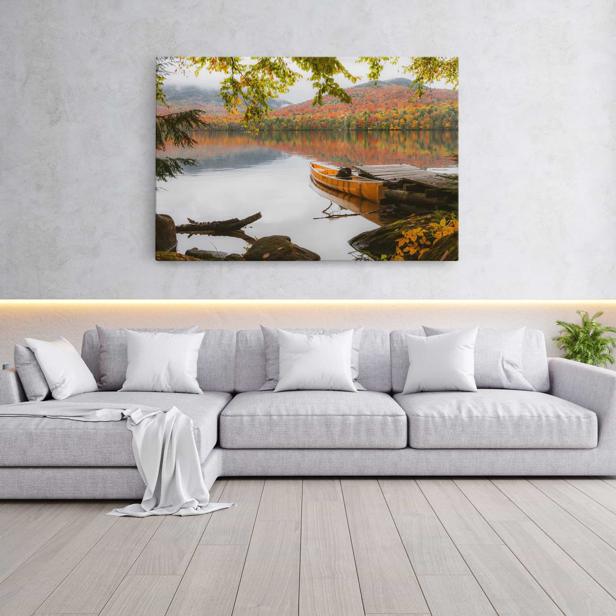 Autumn Morning on Lake Placid Dock with Canoe