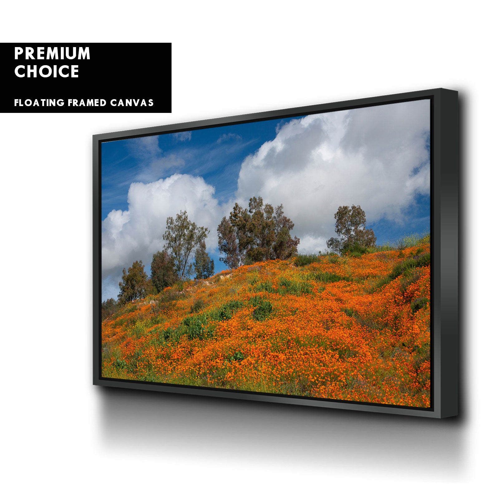 Our premium stretched canvas inserted perfectly in a Roma Moulding™ 100% real Pine Wood frame, with a professional matte black finish, and hanging hardware installed. Our Floater Frames are 5 times sanded & finished without toxins or chipping, for a museum quality framed artwork.