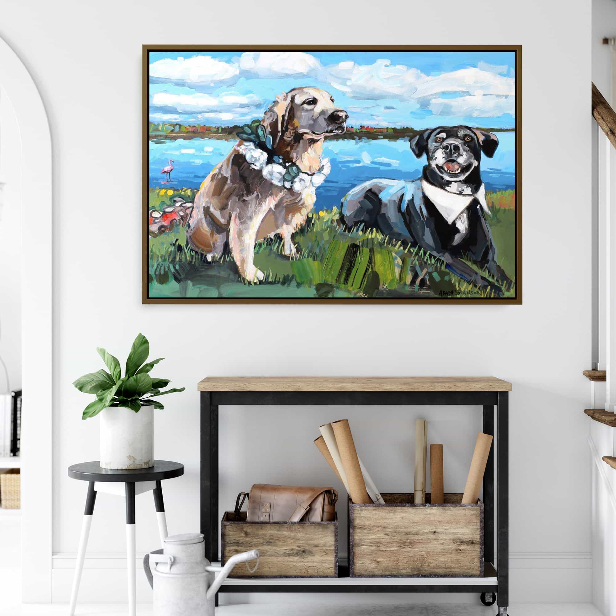 The artwork is beautiful. And beautifully framed. It’s the perfect size for over the fireplace and it really brightens the room. I’m very happy with it.