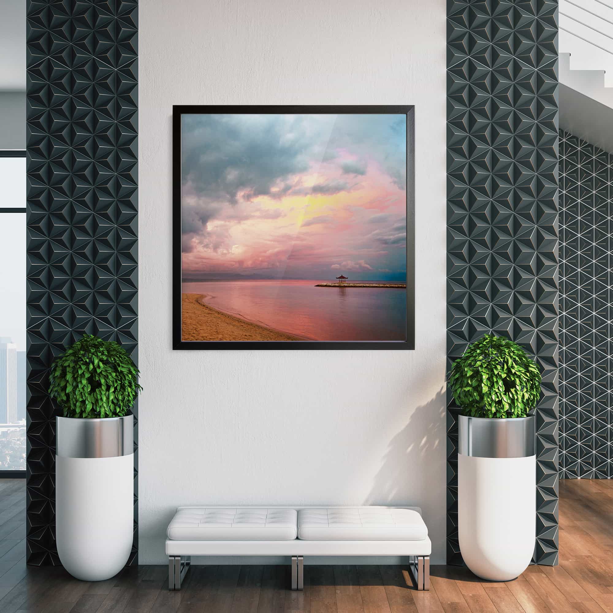The highest quality Fine Art photo paper, in our 100% real wood frame with a professional matte black finish, and hanging hardware installed. Rubber bumpers also included to protect your wall, and make sure your framed print remains straight.